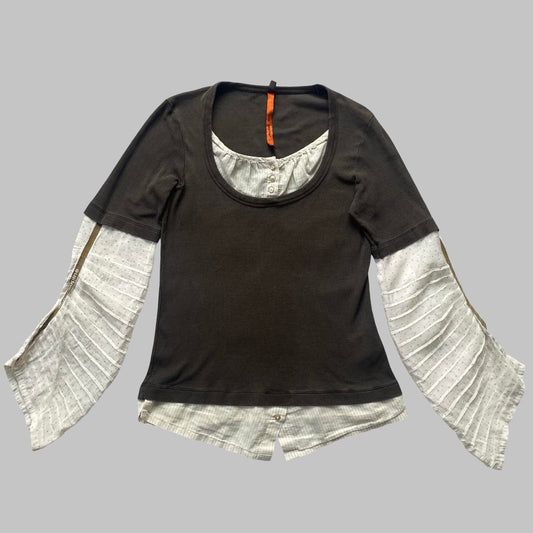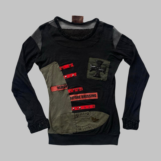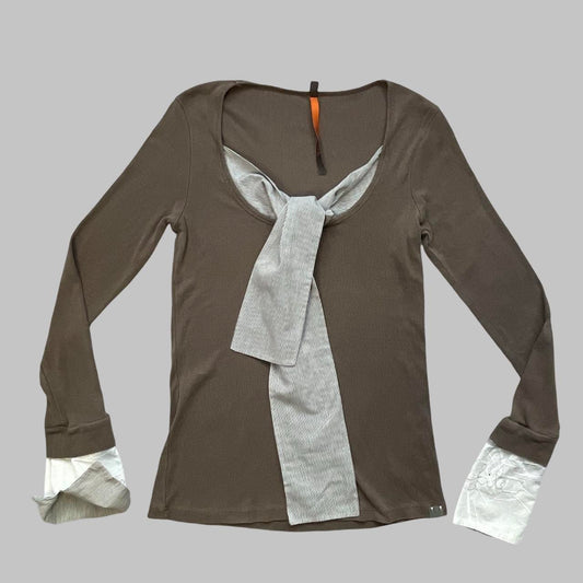 Italian multi-fabric long sleeve khaki and black top.