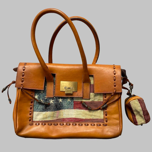 Italian leather birkin shape handbag with American flag tapestry.