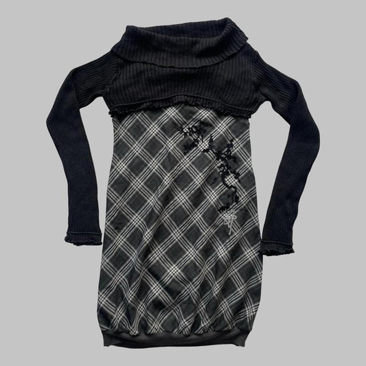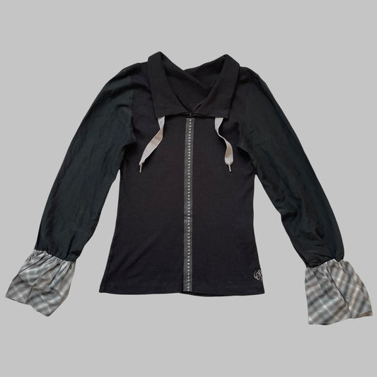 Italian black long-sleeve top with black and plaid motif.
