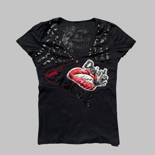 Desigual black t-shirt top with mouth graphic and sequins.