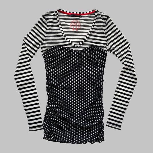 Black & white polkadots and stripes shirt.