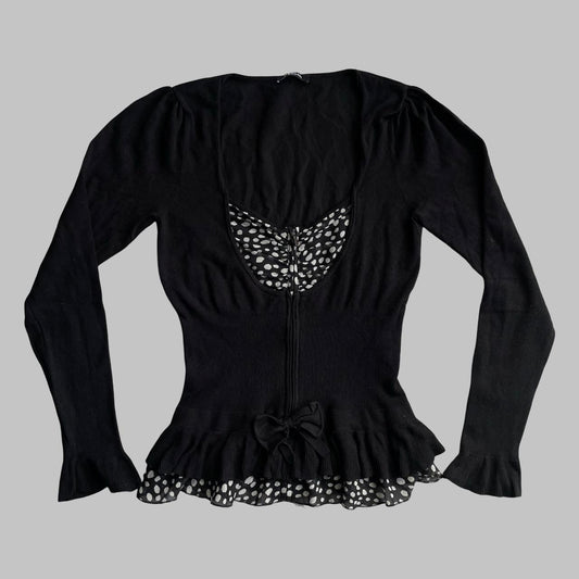 Bi-material zip up black blouse with polkadots.