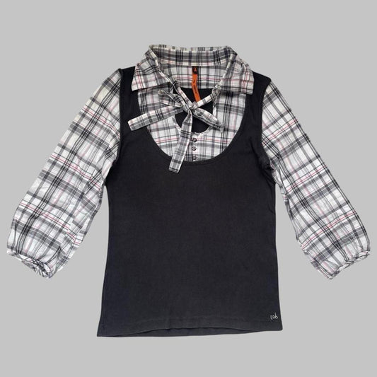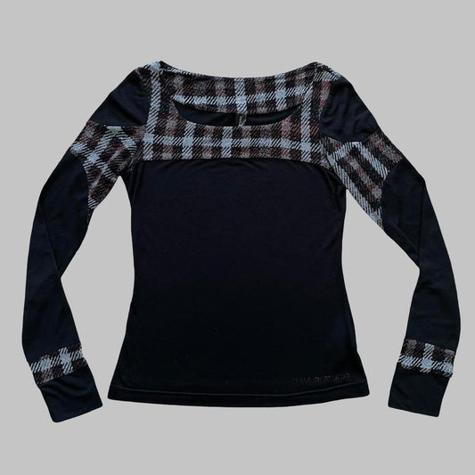 Italian black long-sleeve top with black and plaid motif.