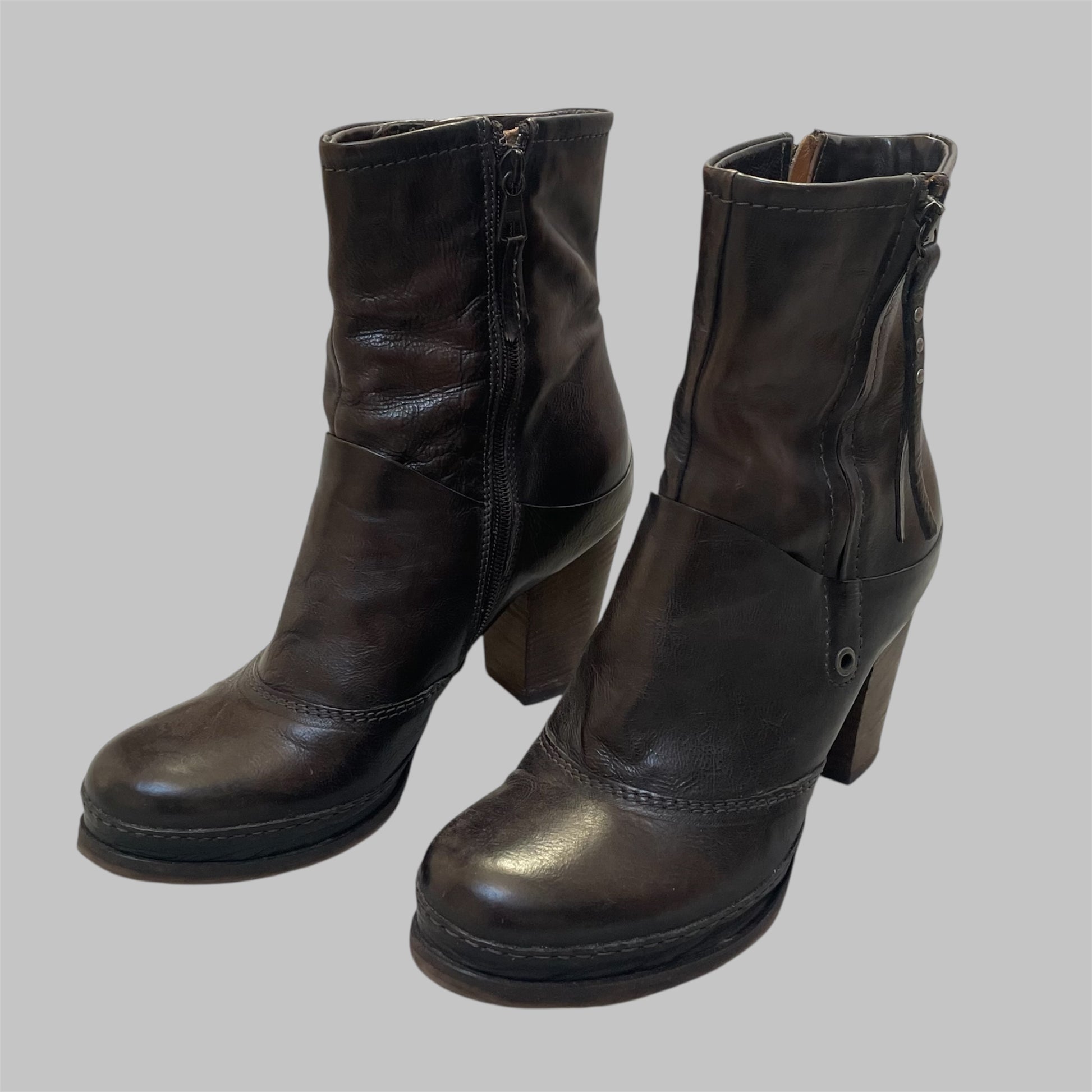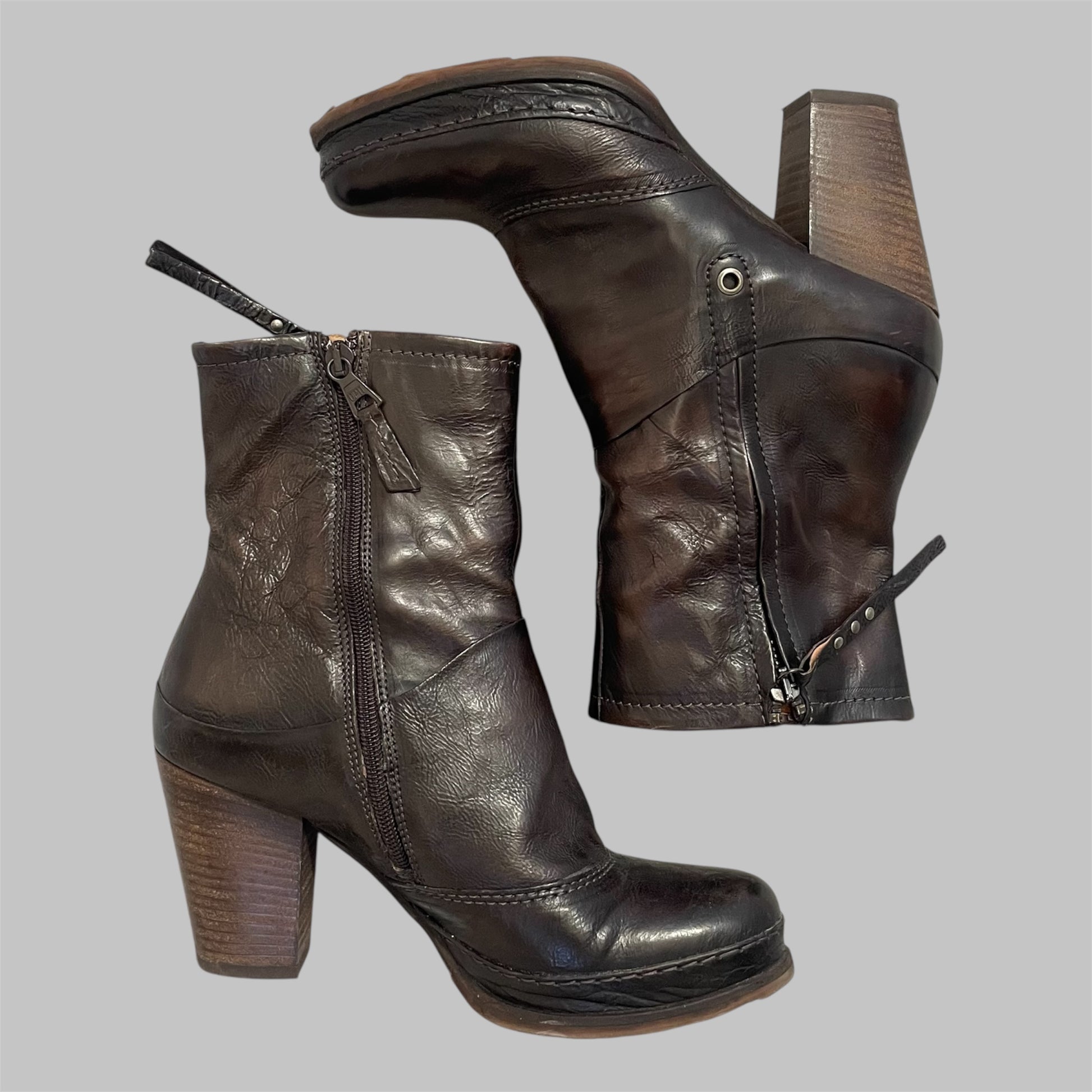 Vintage dark brown / black leather ankle boots by Italian brand A.S.98 (AirStep). Made from soft genuine leather with a naturally distressed finish. Features a stacked wooden block heel, side zipper closure, and decorative leather strap detail with metal studs.