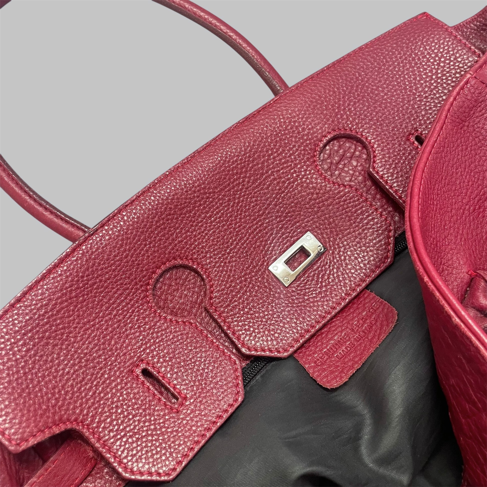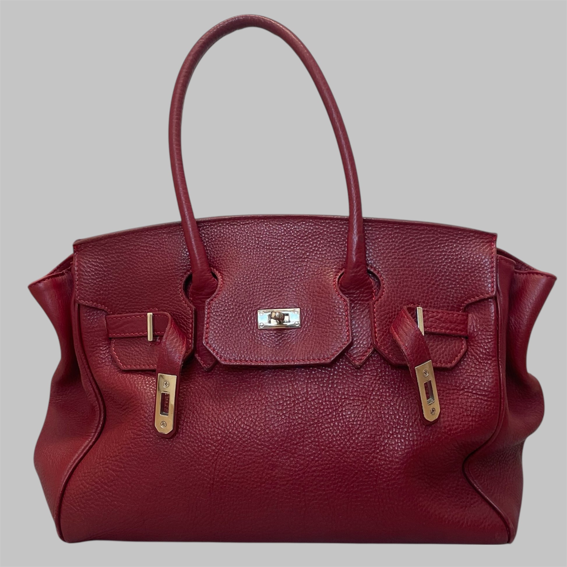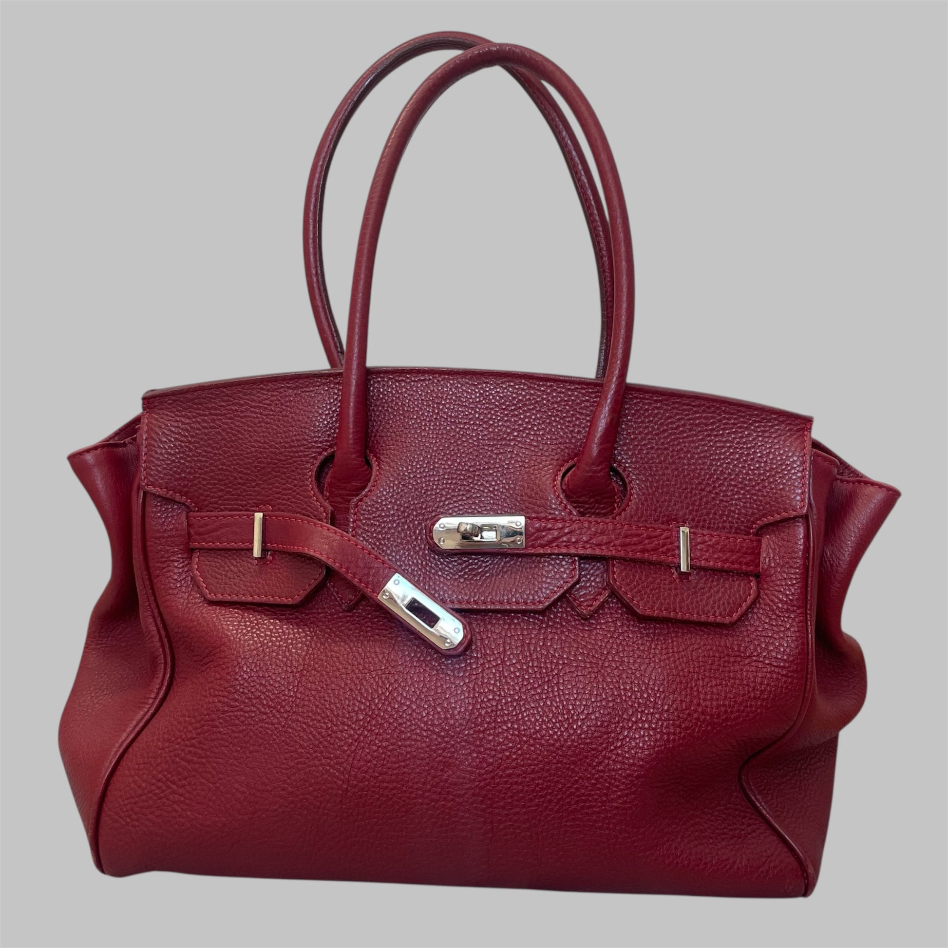 Oversized structured leather bag with double top handles and a turn-lock closure. Crafted from genuine leather in a deep burgundy / wine tone with a natural patina. Spacious interior.