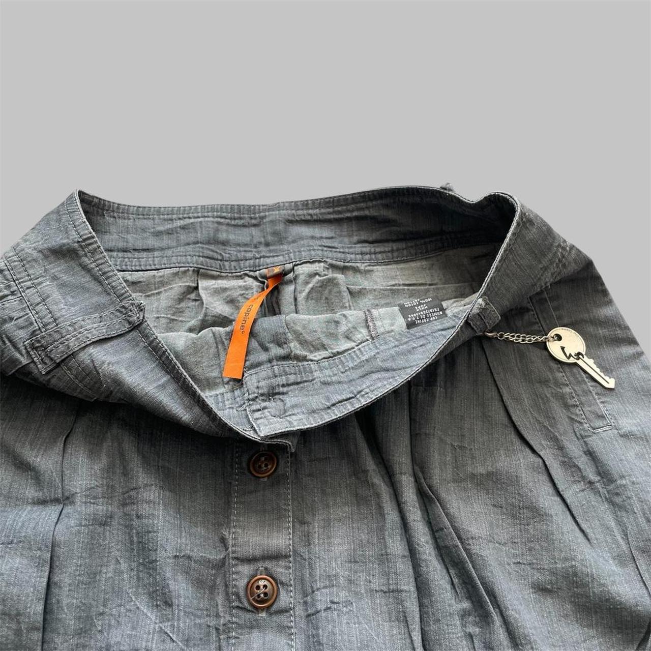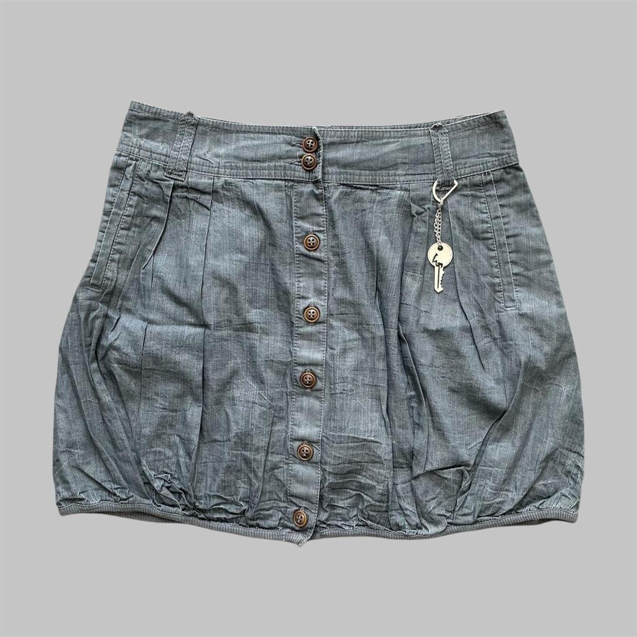 Grey-washed lightweight denim skirt featuring a subtle bubble silhouette, front button closure and small detachable key charm detail. Soft and slightly crinkled fabric.