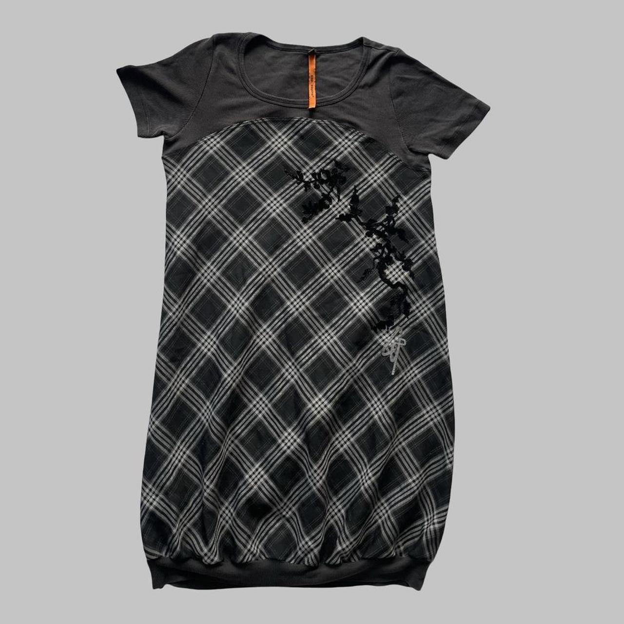 Vintage black and grey 2-piece dress set by Cop Copine, featuring a plaid bubble dress with flocked velvet floral detail on the front. Comes with its original matching black ribbed knit bolero with lettuce-edge finish and wide folded neckline.