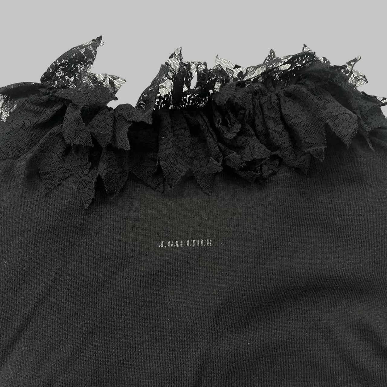Elegant vintage cardigan featuring a dramatic ruffled lace collar that adds a romantic, Victorian-inspired touch. Made from a soft, fine knit fabric that feels comfortable on the skin. Fitted silhouette with button-down front and ribbed hem.