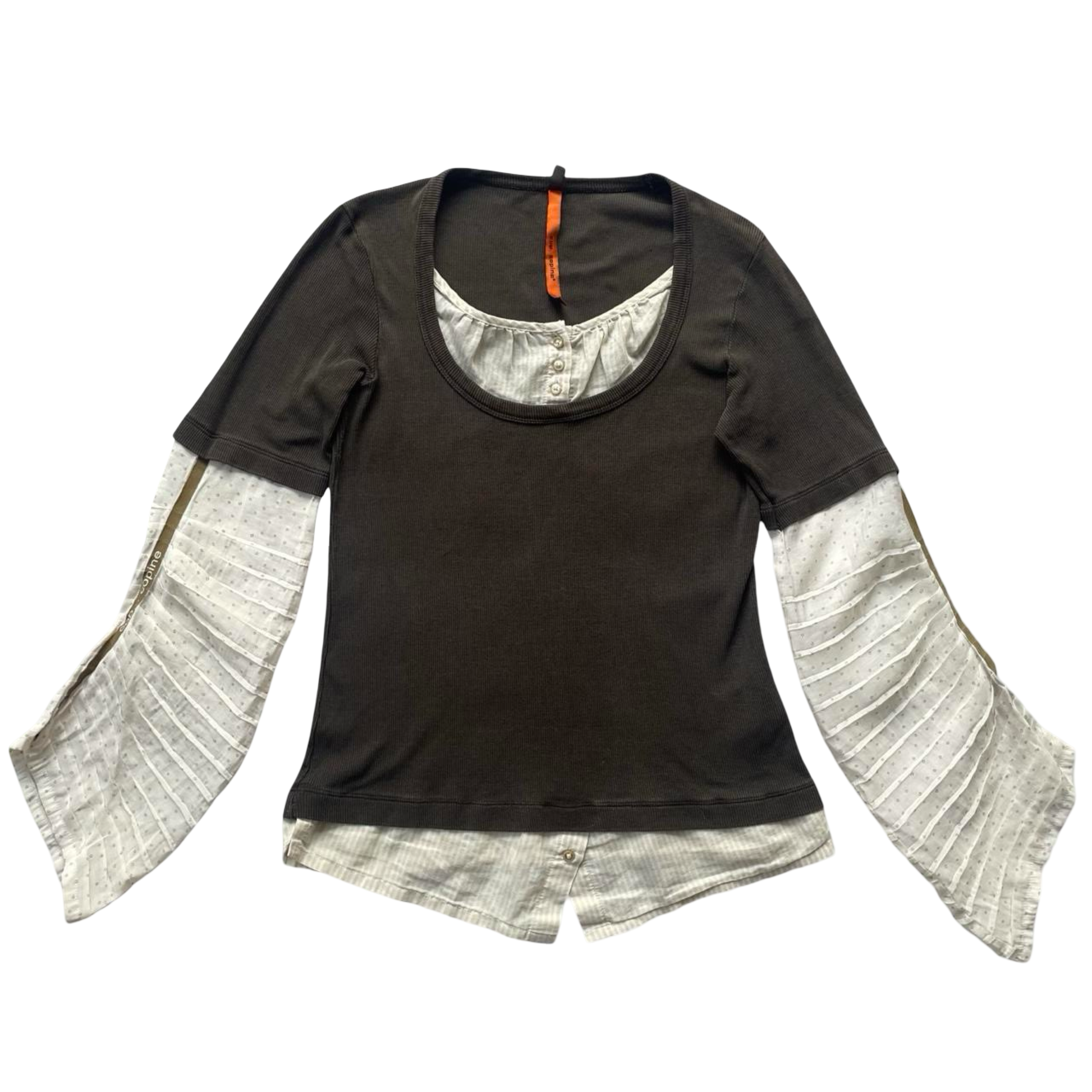 Cop copine milkmaid two-tone long-sleeve top featuring a layered look with mixed fabrics. The body is made from a ribbed, stretchy knit in dark brown, while the sleeves and hem feature lightweight off-white cotton panels with subtle patterns. Buttoned detailing at the neckline and hem, and pleated sleeves with a visible Cop Copine logo ribbon.